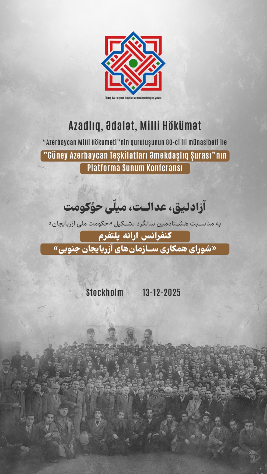 “Azərbaycan Milli Hökuməti”nin qurulmasının 80 illiyi münasibətilə, “Güney Azərbaycan Təşkilatları Əməkdaşlıq Şurası” (GATƏŞ) 2025-ci ilin 13 dekabr tarixində İsveçin Stokholm şəhərində bir konfrans keçirəcəkdir