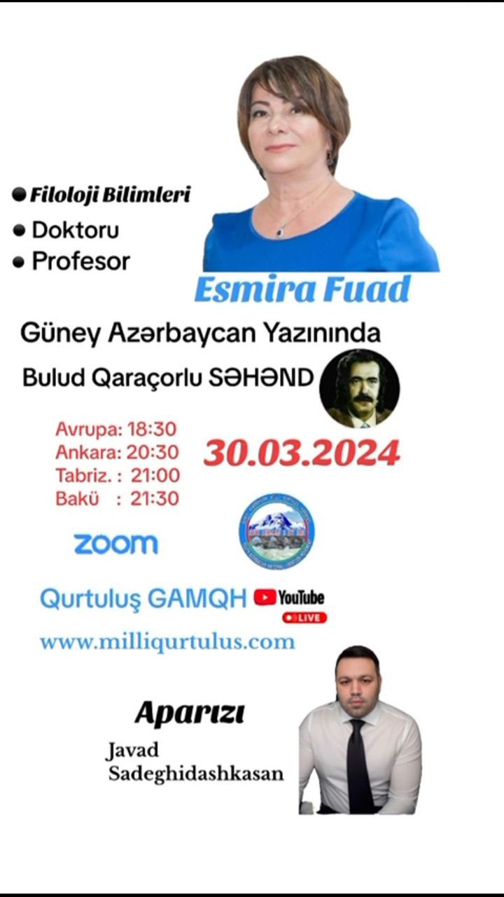 گونئی آزربایجان یازینیندا بولود قاراچورلو سهند هفتهلیک زووم کونفئرانسلاری ائسمیرا فواد؛ فیلولوژی بیلیملر پوروفئسسورو گونئی آزربایجان یازینیندا بولود قاراچورلو سهند ۶-جی گون ۳۰.۰۳.۲۰۲۴ آوروپا. ۱۸:۳۰ تورکییه. ۲۰:۳۰ تبریز. ۲۱:۰۰ باکی.…